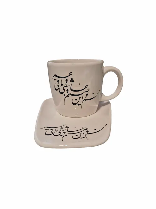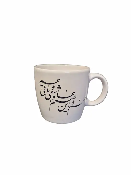 ماگ و زیرماگی طرح منم و این صنم عاشقی و باقی عمر یک ماگ کاملا دست ساز و از جنس سرامیک است.