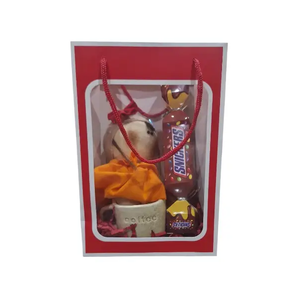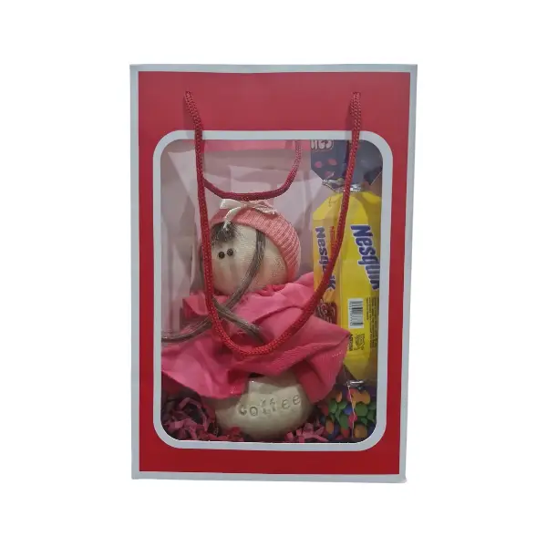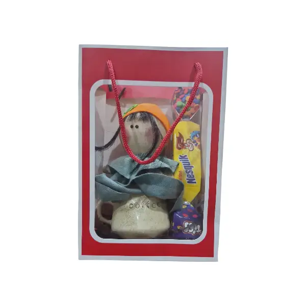 این پک که به صورت ساک طلقی می باشد دارای یک عدد فنجان اسپرسو خوری و یک عدد عروسک روسی 15 سانتی متری است.