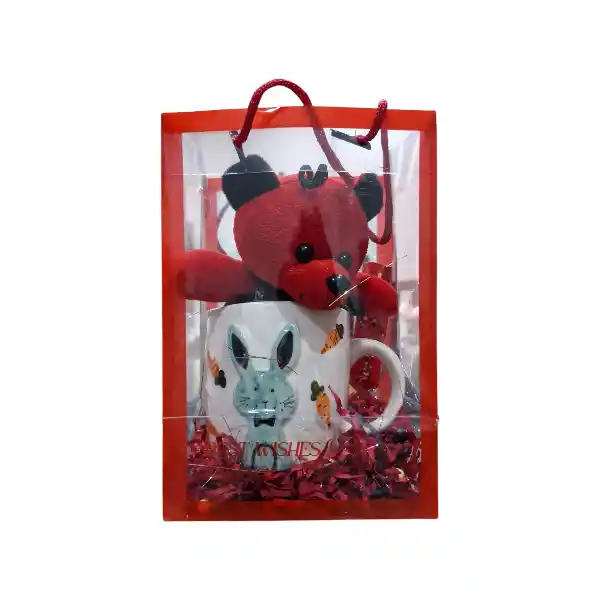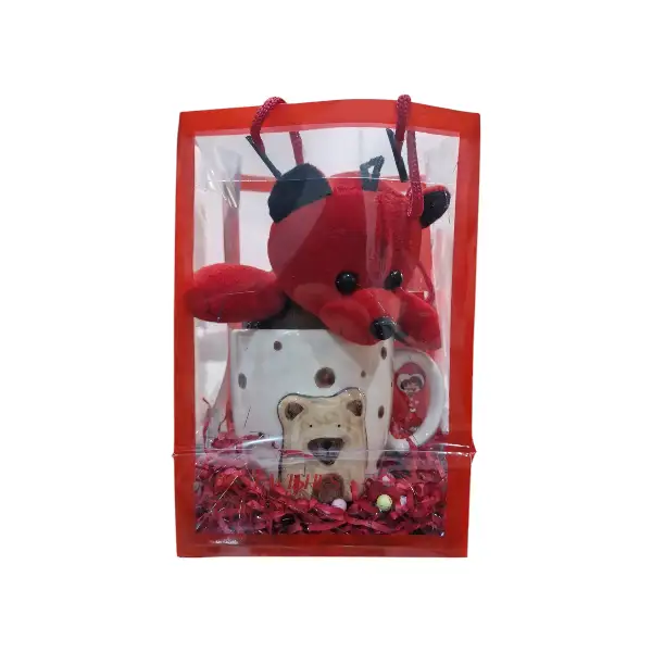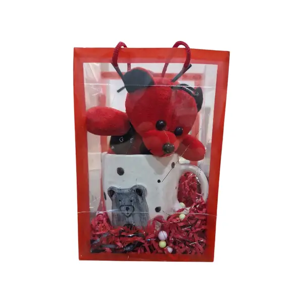 این پک که به صورت ساک طلقی می باشد دارای یک عدد ماگ طرح برجسته و یک عدد خرس 15 سانتی متری قرمز است.
