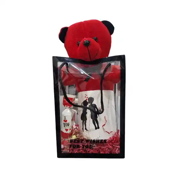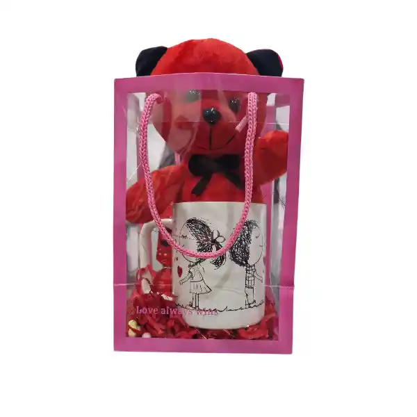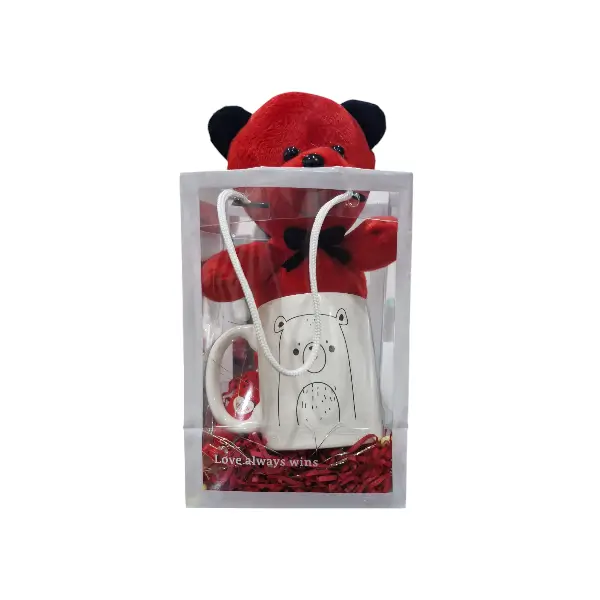 این پک که به صورت ساک طلقی می باشد دارای یک عدد ماگ و یک عدد خرس 20 سانتی متری قرمز است.