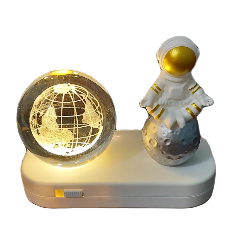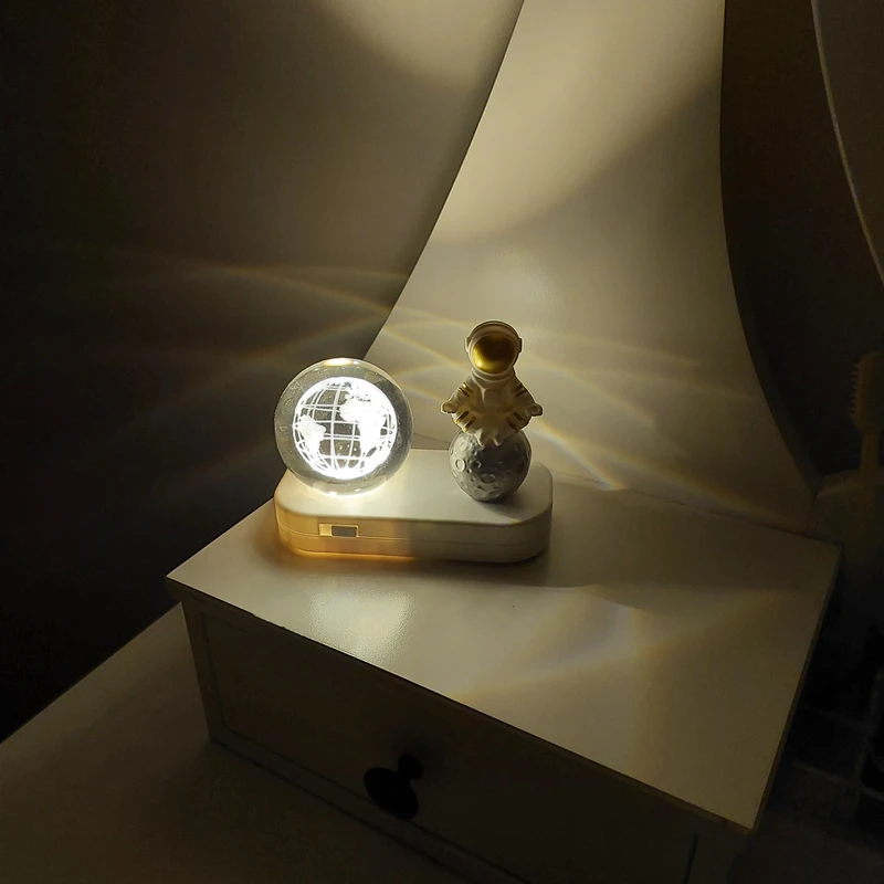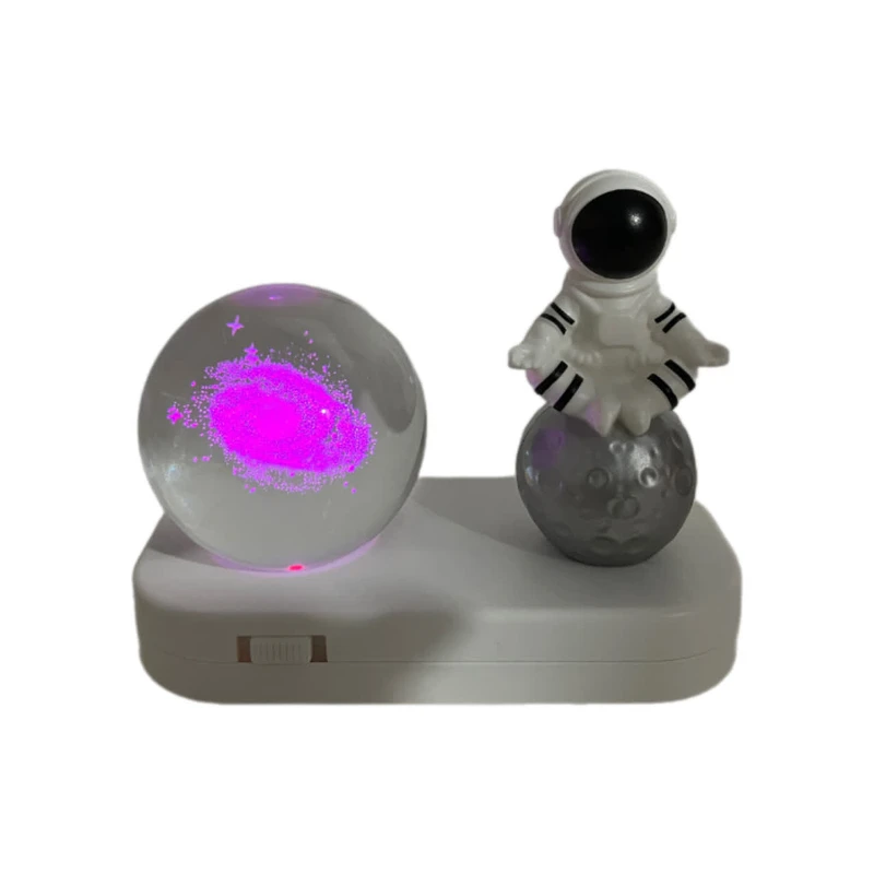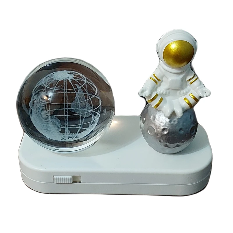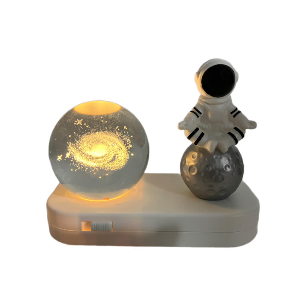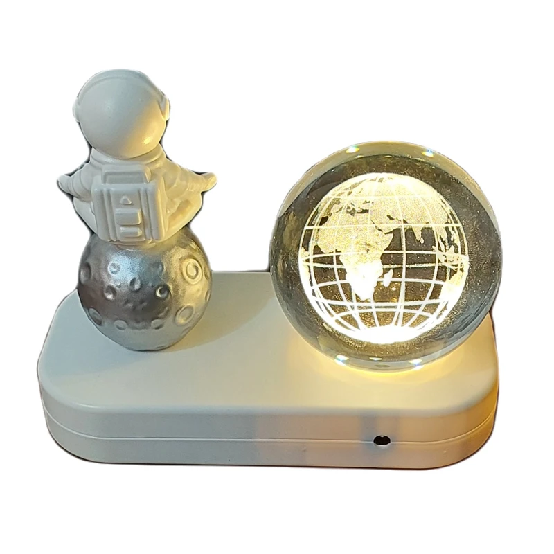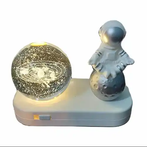 چراغ خواب مدل فضانورد و گوی، که در زیر گوی چراغ LED با نور ثابت آفتابی و نور چند رنگ متغییر جلوه خاصی به اتاق میبخشد .همچنین در کنار گوی مجسمه ای از فضانورد قرار گرفته است که زیبایی آن را دو چندان میکند.شما میتوانید این چراغ را از طریق کابل USB به هر منبع تغذیهای که دارای پورت USB است، متصل کنید و آن را شارژ کنید.