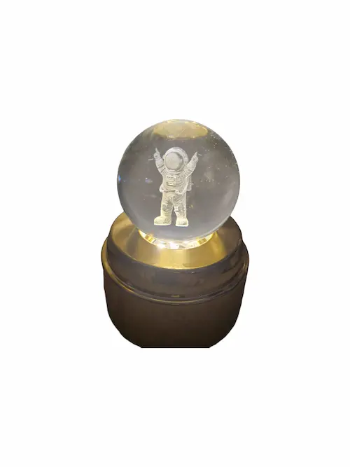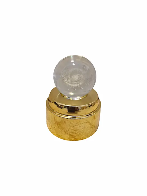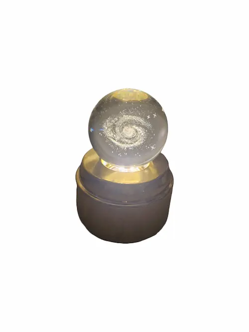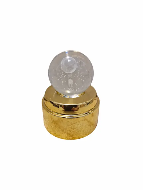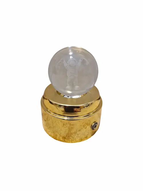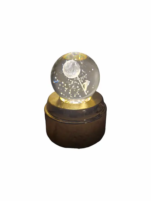پایه ی طلایی رنگ زیر گوی از طریق کابل مربوطه به کلگی شارژر متصل می گردد و سپس LED های روشنایی که داخل پایه ی طلایی رنگ طراحی شده اند و با اهرم چرخش خودکاری که در وسط چراغ های ال ای دی دارد گوی به طور خودکار میچرخد و روشنایی دل انگیزی به گوی می دهند طوری که طرح داخل گوی به زیبایی می درخشد و نور بر روی سقف اتاق می تابد .