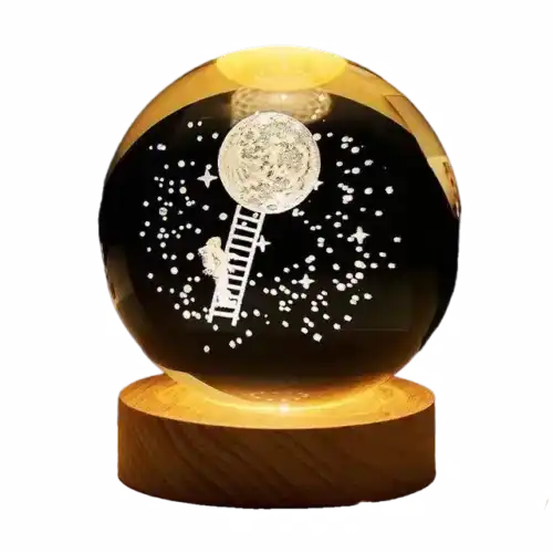 گوی کریستالی از یک نوع کریستال با کیفیت بالا و شفافیت زیاد است. پایه از جنس چوب است که با طراحی ساده و زیبا گوی را داخل خود نگه میدارد. پایه چوبی دارای یک کابل USB است که چراغ LED را روشن میکند
